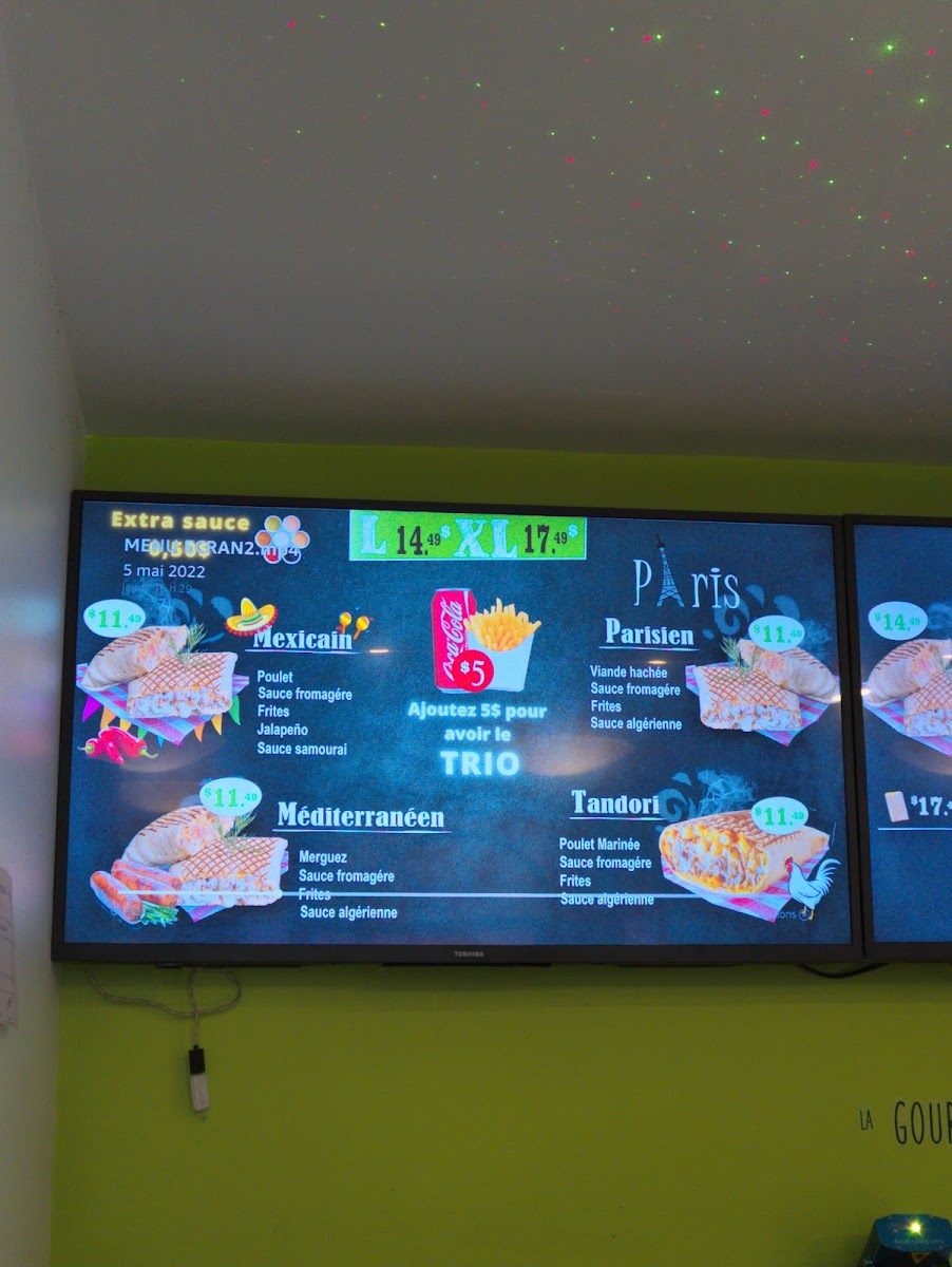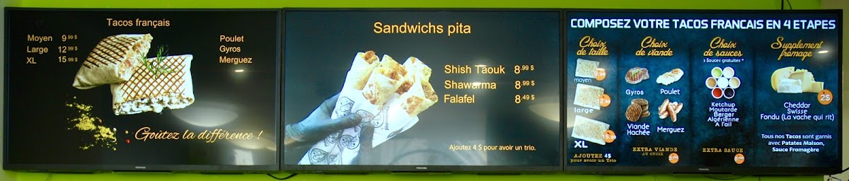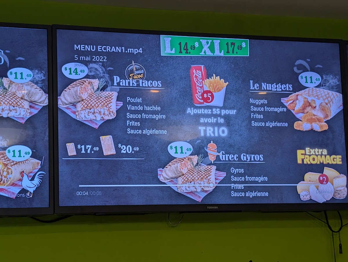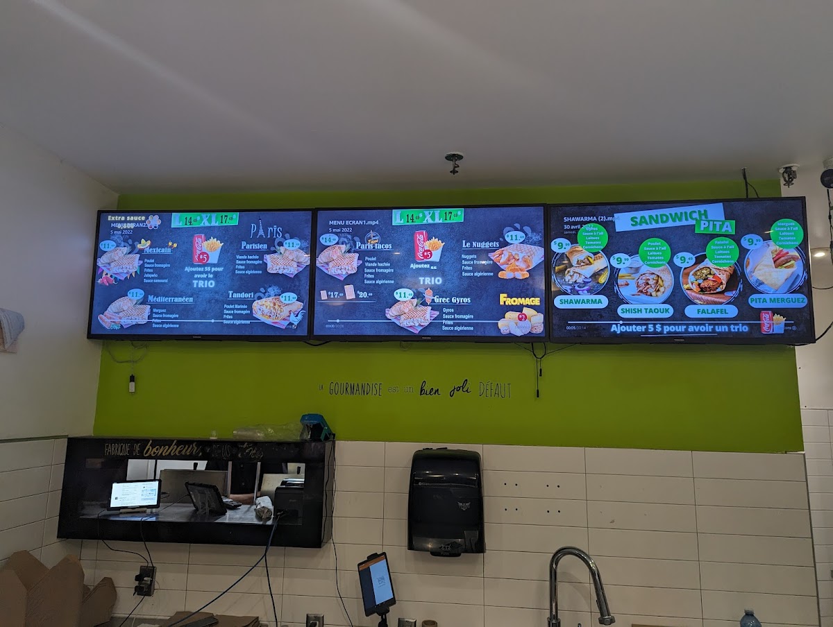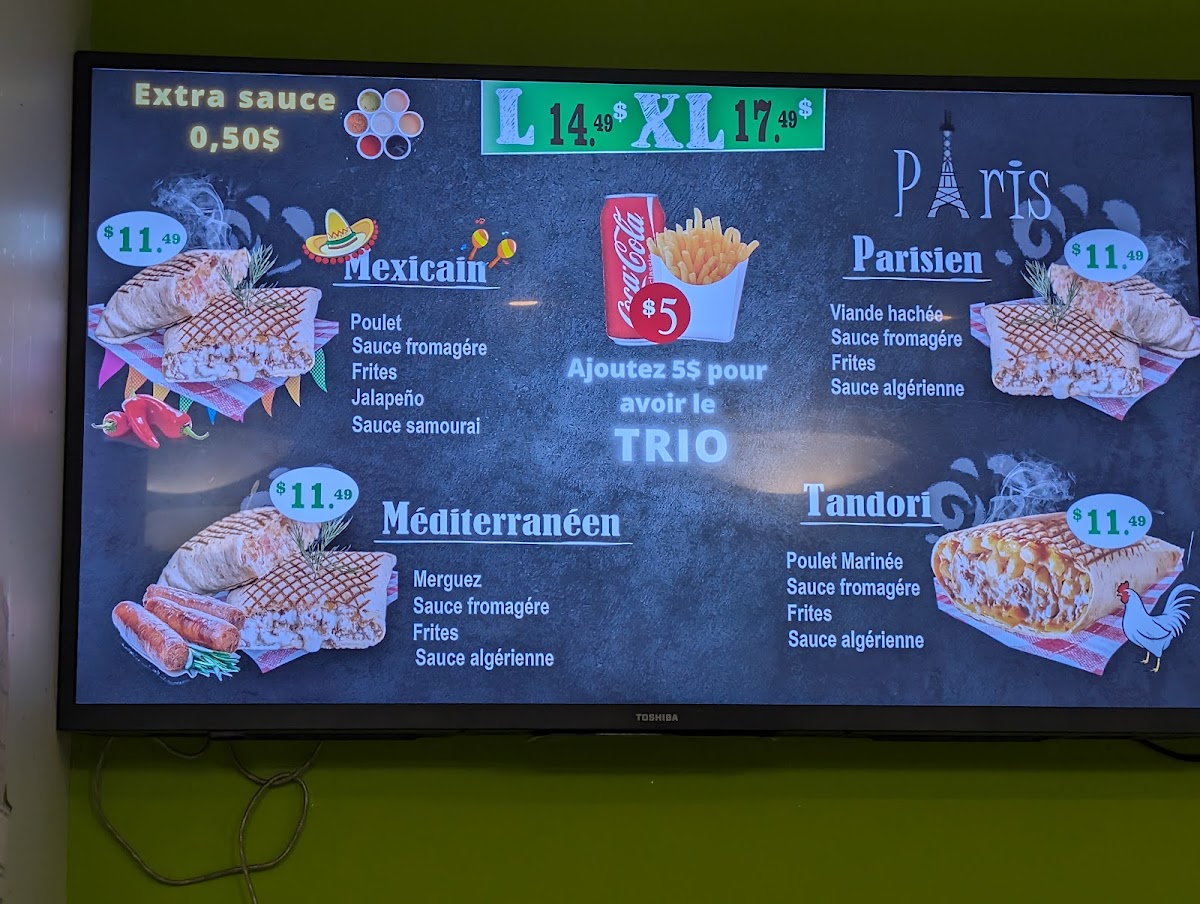 Paris Tacos in Québec offers a unique blend of Middle Eastern flavors fused within the classic taco experience, all served with a halal guarantee. Their menu features tacos in various sizes—from Medium and Large to Extra Large Trio options—that come paired with crispy fries and refreshing beverages, creating a satisfying, complete meal. Standout dishes like the Shish Taouk, available both solo and in trio form, showcase tender, marinated chicken infused with delicate spices, winning over locals and tourists alike. Vegetarians will appreciate the Pita Falafel, a flavorful, plant-based delight.